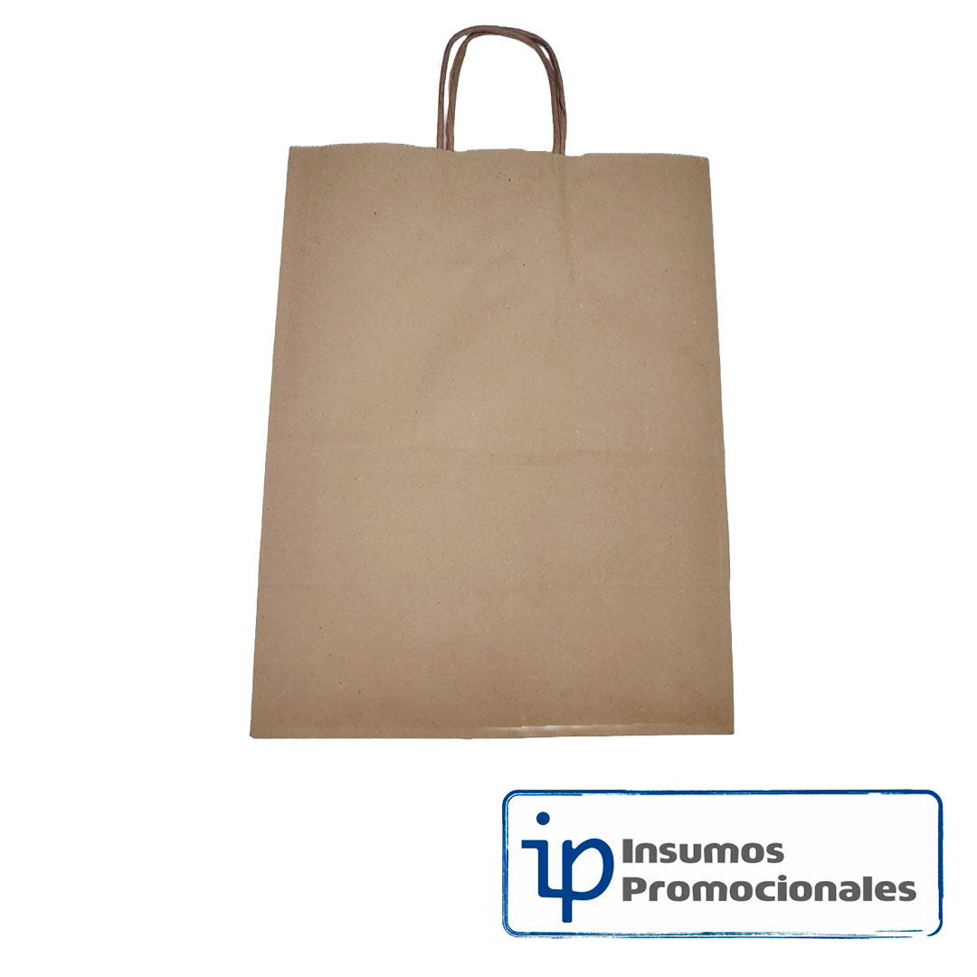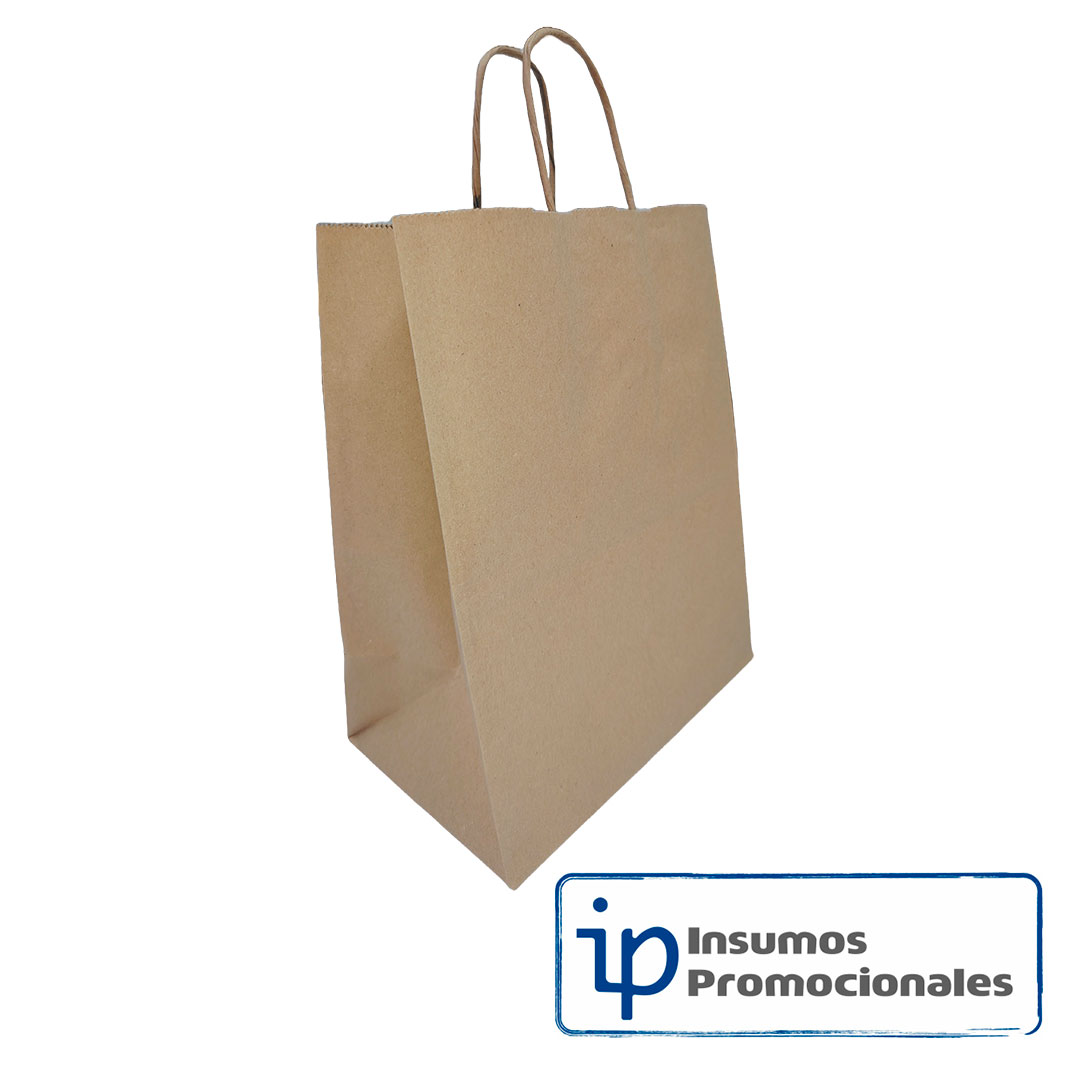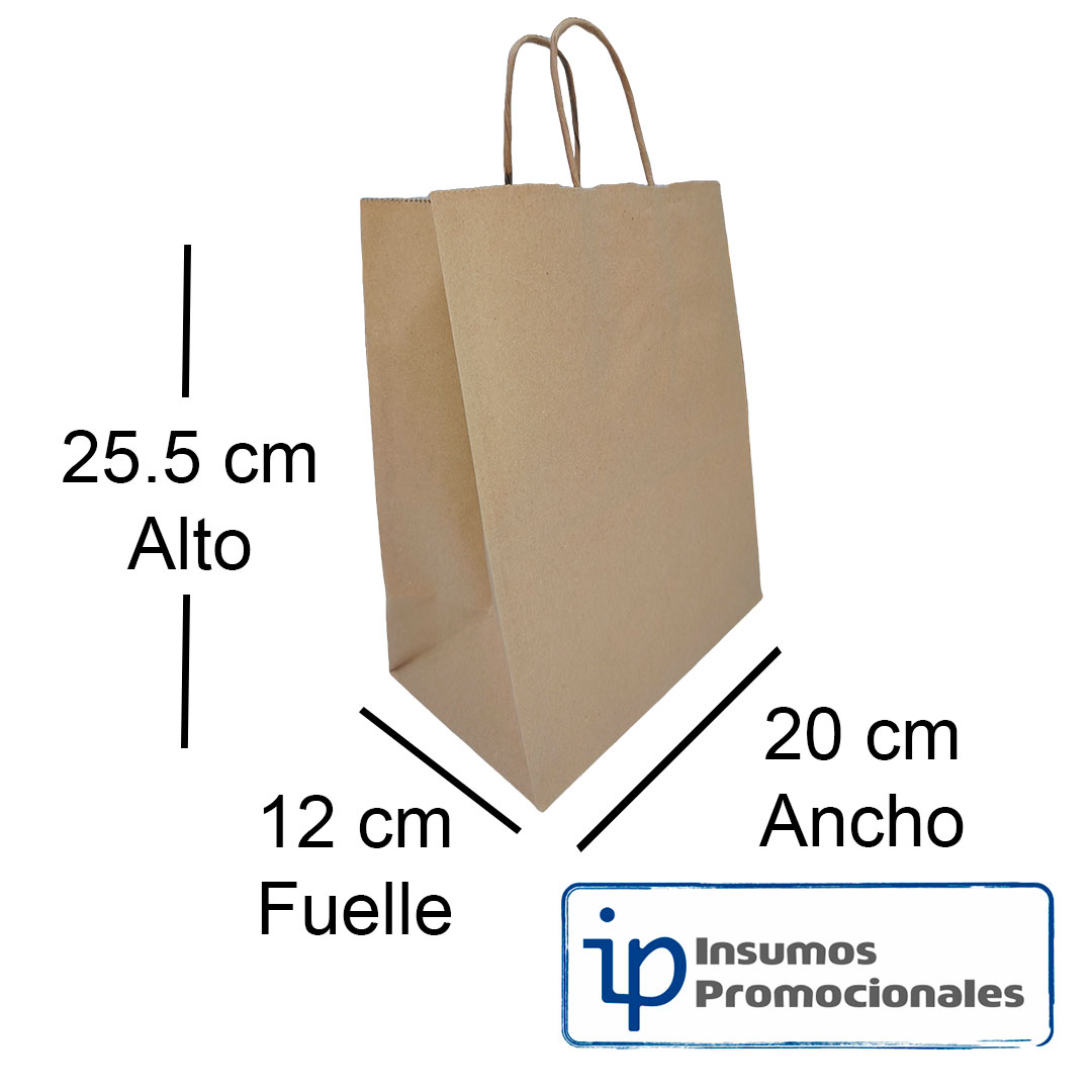 Bolsa de papel Kraft con manija, disponibles únicamente en color CAFÉ, material ecológico, biodegradables. Ancho 20 cm, alto 25.5 cm, fuelle 12 cm. Ideales para empacar, el cliente las puede personalizar, paquete x 12 unidades.