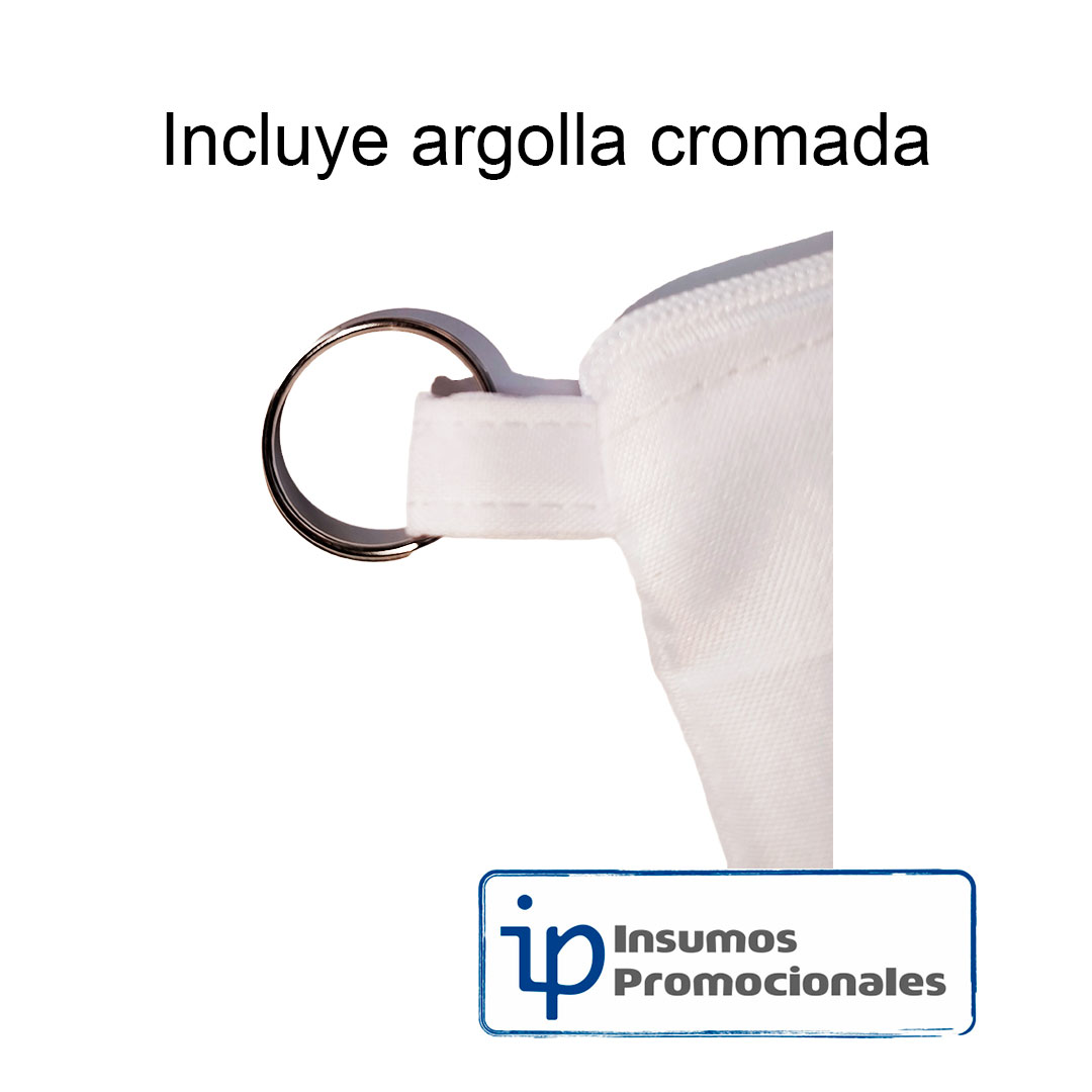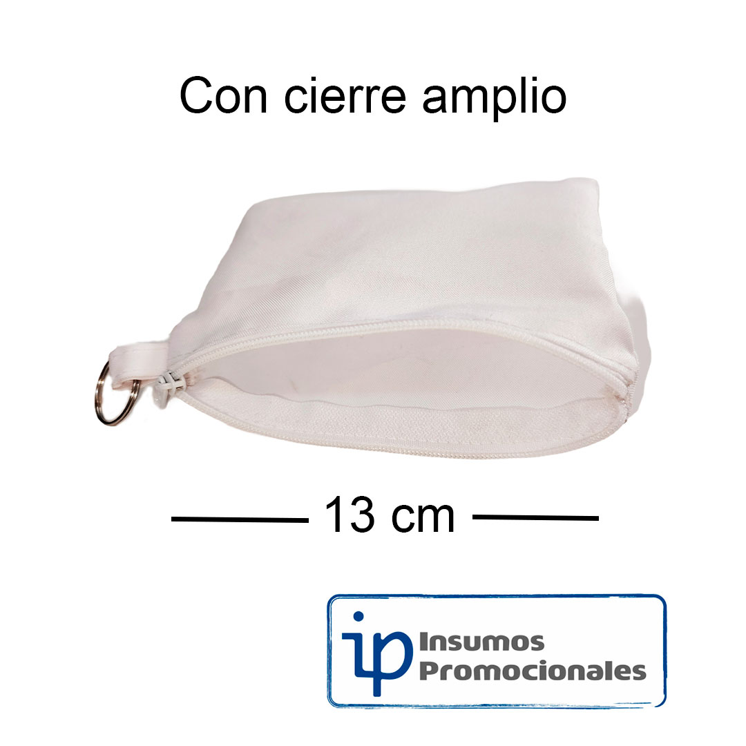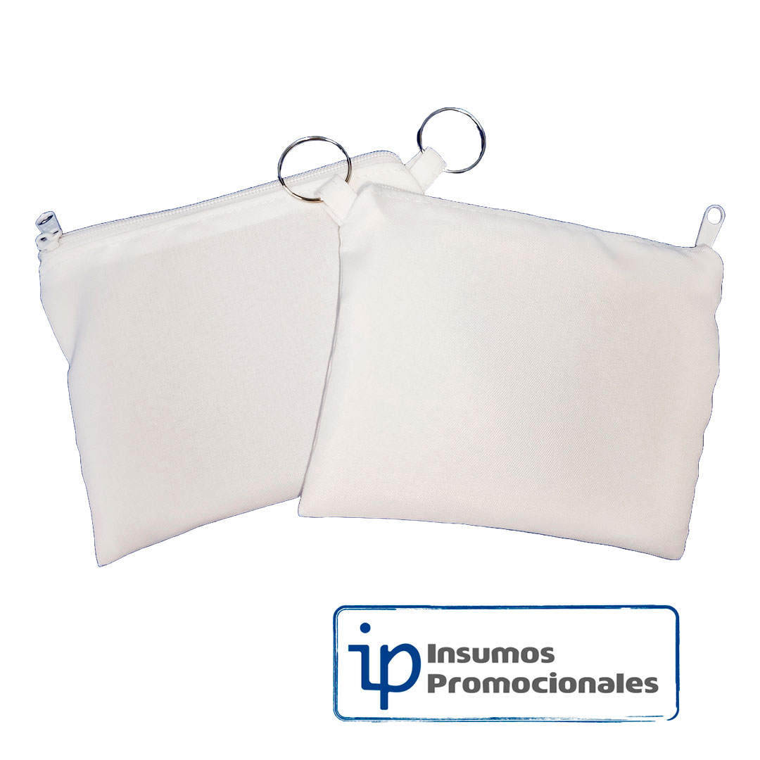 Monedero BLANCO en tela 100% poliéster, fácil lavado y rápido secado, medidas 10 cm de alto, 14 cm de ancho. Con cierre y argolla cromada. Se puede personalizar en sus dos caras, se puede trabajar con técnica de sublimación, estampado, DTF.